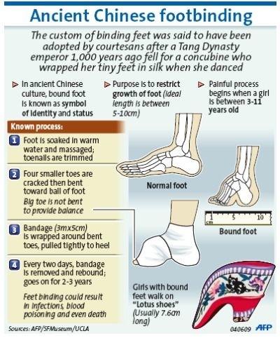 Foot binding is the Chinese custom of applying tight bandages to the feet of young girls. This binding severely limits growth of the feet, deforming them painfully. Foot binding became popular as a means of displaying status (women from wealthy families, who did not need their feet to work, could afford to have them bound) and was correspondingly adopted as a symbol of beauty in Chinese culture.