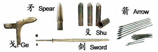An important element of the army is the chariot, of which four types were found. In battle the fighting chariots form pairs at the head of a unit of infantry. The principal weapon of the charioteers was the ge or dagger-axe, an L-shaped bronze blade mounted on a long shaft used for sweeping and hooking at the enemy. Infantrymen also carried ge on shorter shafts, ji or halberds and spears and lances. For close fighting and defense, both charioteers and infantrymen carried double-edged straight swords. The archers carried crossbows, with sophisticated trigger mechanisms, capable of firing arrows farther than 800 meters (2,600 ft).