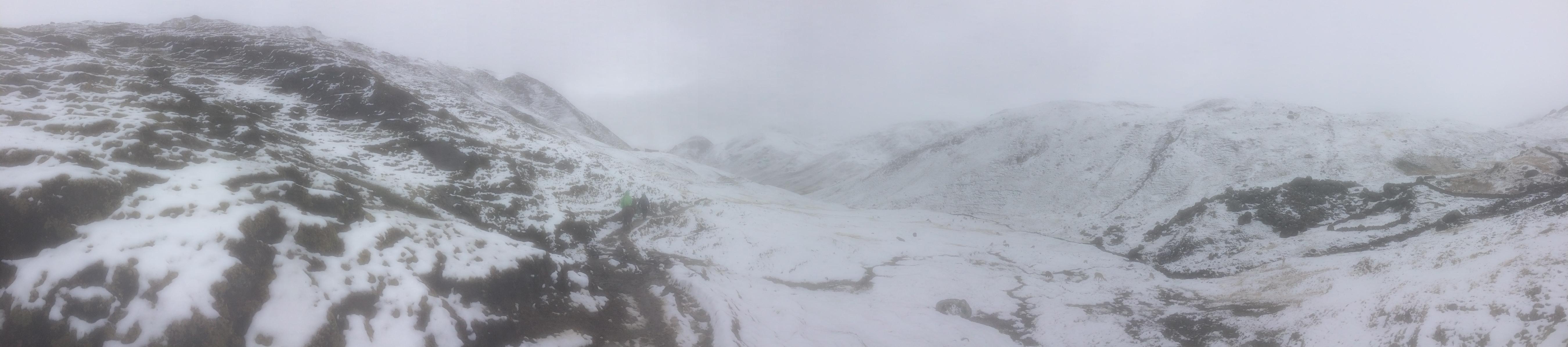 This gracious act was more fortuitious than we could know at the time. This is supposed to be the dry season, when it rains at most once a month. We figured we’d had the worst of it, and that tomorrow would be cold but dry. Instead, we ascended from Pedro’s house toward the high pass separating Lares Valley from the Sacred Valley in another steady, chilled drizzle. By midmorning, this had turned to a full on snow storm.