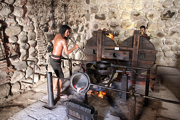 Indigenous laborers added mercury to raw ore, before burning it off to extract pure silver. Mercury is incredibly poisonous, and most laborers doing this job were dead within months. Molten silver is poured into a mold in order to create pure bars.