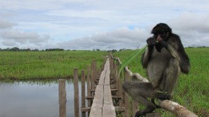 Disproportionately long limbs and long prehensile tails make them one of the largest New World monkeys and give rise to their common name. Spider monkeys live in the upper layers of the rainforest, and forage in the high canopy, from 25 to 30 m (82 to 98 ft). They primarily eat fruits, but will also occasionally consume leaves, flowers, and insects. Due to their large size, spider monkeys require large tracts of moist evergreen forests, and prefer undisturbed primary rainforest. They are social animals and live in bands of up to 35 individuals but will split up to forage during the day.