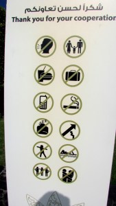 Mosques, like most places of worship, have clearly defined rules for proper behavior. Based on this sign at the grand mosque, can you tell what behaviors are not acceptable in a mosque?