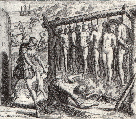 “The Spaniards with their horses, their spears and lances, began to commit murders and other strange cruelties. They entered into towns and villages, sparing neither children nor old men and women. They ripped their bellies and cut them to pieces as if they had been slaughtering lambs in a field. They made bets with each other over who could thrust a sword into the middle of a man or who could cut off his head with one stroke. They took little ones by their heels and crushed their heads against the cliffs. Others they threw into the rivers laughing and mocking them as they tumbled into the water. They put everyone they met to the edge of the sword.
