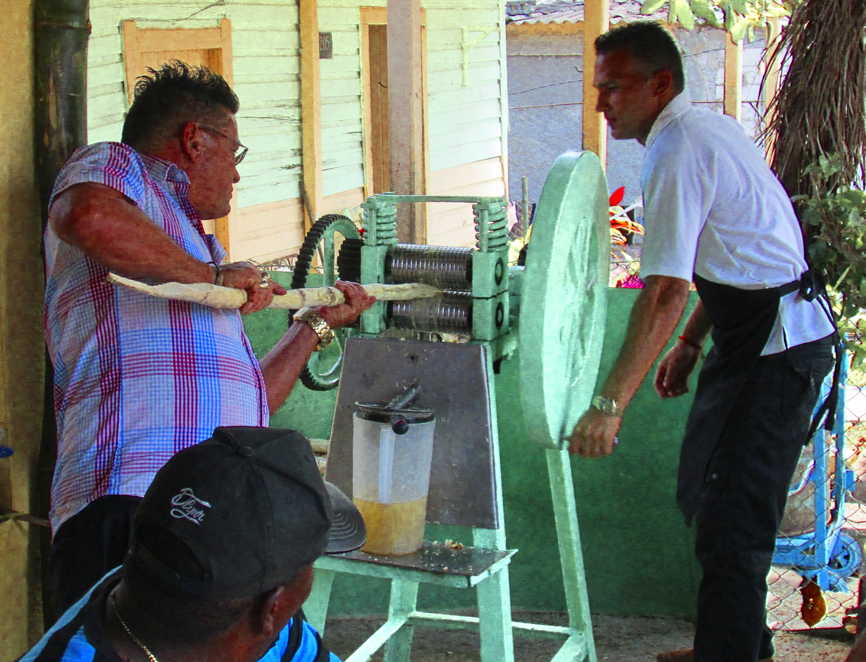Cubans operating a press to extract the sugary juice from the cane. (Havana, Cuba, 2017.)