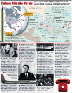 October 22, 2012 — Fifty years ago, in October 1962, the world hovered on the brink of nuclear war with the United States and the Soviet Union locked in a standoff at the height of the Cold War. The crisis lasted 13 days before the Soviet Union backed down and withdrew missiles from Cuba in return for a U.S. pledge not to invade the Caribbean island and a secret deal to dismantle American missiles in Turkey. Graphic shows timeline of the Cuban Missile Crisis.