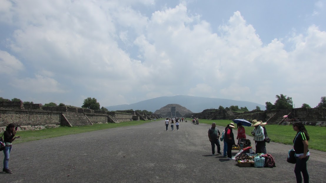 Photo taken at the rough midpoint of the Avenue of the Dead, looking toward the Pyramid of the Moon. (Teotihuacan, Mexico, 2016.)