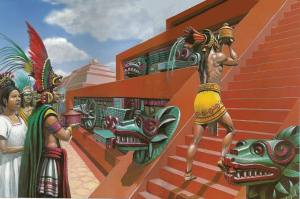 At artist’s rendition depicts the rulers of Teotihuacan making a sacrificial offering at the Temple of the Feathered Serpent. Seen in the background is the Temple of the Sun. Both structures would likely have been covered in red plaster during the city’s heyday.