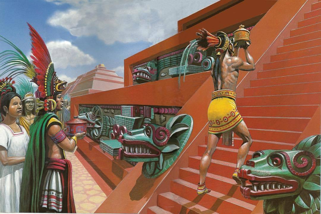 At artist’s rendition depicts the rulers of Teotihuacan making a sacrificial offering at the Temple of the Feathered Serpent. Seen in the background is the Temple of the Sun. Both structures would likely have been covered in red plaster during the city’s heyday.