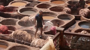 A man and his son drop animal hides – goats, cows, or camels, usually – into vats of chemicals, which dye and preserve the skins as leather.