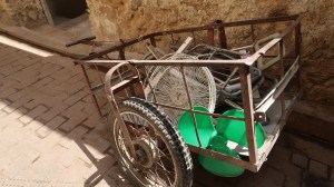 This cart is loaded with scrap metal for recycling. Any waste collection within the medina is done this way, on a human or mule-drawn carts. In truth, residents of the medina purchase most food without packaging in the local souq, meaning that they produce little inorganic waste. Large trash trucks are not really necessary here, even if they were possible.