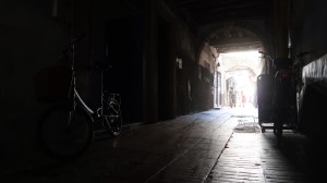 This public street runs completely underneath a multi-story home. Public parking typically means room for a bicycle or a hitch for a mule.